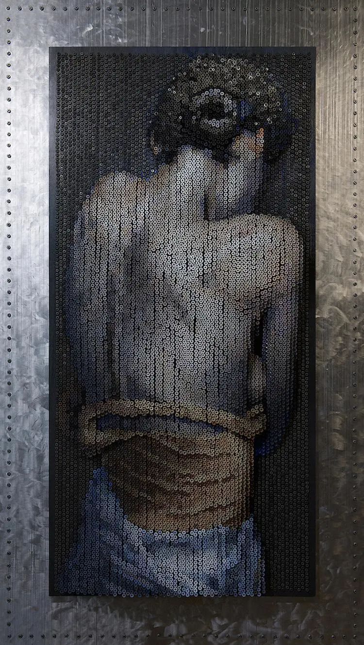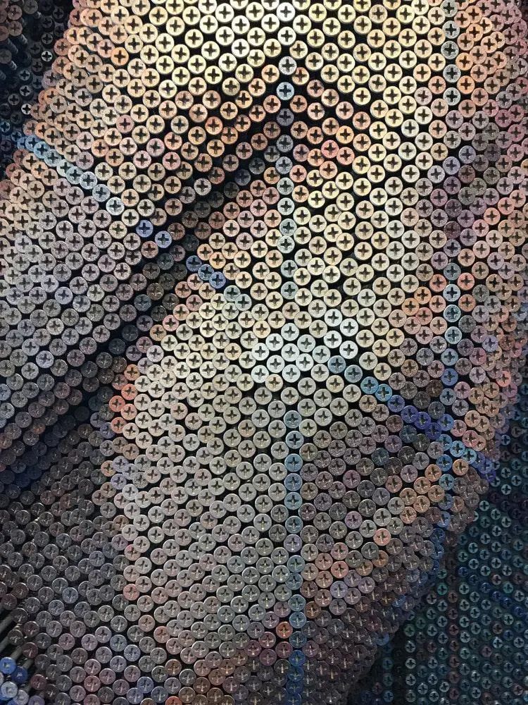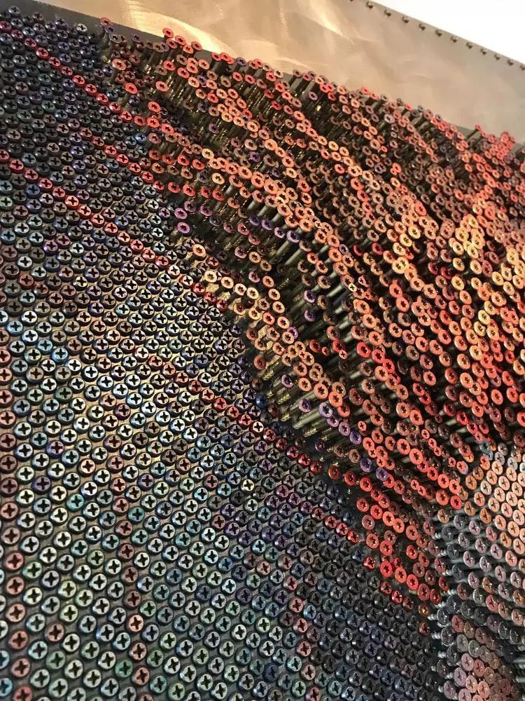 从这位艺术家的这段话,我们就能看得出来,他善于打破传统,用更新颖的方式看世界。他使用20000多颗螺丝钉打造的3D肖像画,就给人留下了非常深刻的印象,让人们一下子记住了这位“硬核”艺术家。