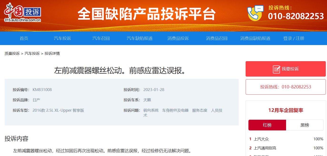 中国网汽车2月7日讯 中国投诉-全国缺陷产品投诉平台【进入黑猫投诉】(https://315.auto.china.com.cn/) 今年1月28日接到一位东风日产天籁车型车主的投诉,称“自己的东风日产天籁车型存在左前减震器螺丝松动和感应雷达误报的情况”。