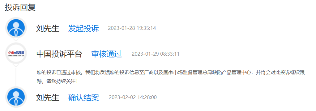 中国投诉-全国缺陷产品投诉平台于2023年1月28日收到该投诉,核实相关信息后,迅速组织工作人员与车主进行沟通。在今年的2月2日,投诉车主刘先生在平台提交结案。记者在发稿前电话联系投诉车主刘先生得知,车主在找到中国投诉-全国缺陷产品投诉平投诉后,他购车的这家4S店就联系了他,经过店面售后的检测和维修,已经帮他再次加固了车辆的减震器螺丝;另外,车辆雷达问题也经过多次检测,原因是刘先生的车辆号牌安装位置的问题造成了车辆前雷达的异常,目前据天籁车主刘先生确认,他的车辆目前已经可以正常使用。最后天籁车主刘先生表示,再次感谢中国投诉-全国缺陷产品投诉平台帮助他解决投诉问题,刘先生激动地表示,仅仅5天的时间平台就解决了他投诉多时的问题,后续若还有汽车问题,仍将第一时间找到中国投诉-全国缺陷产品投诉平台进行反馈。
