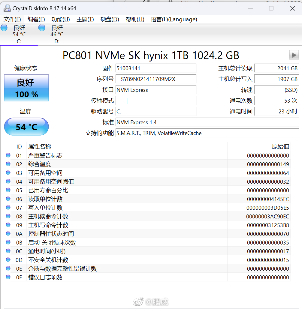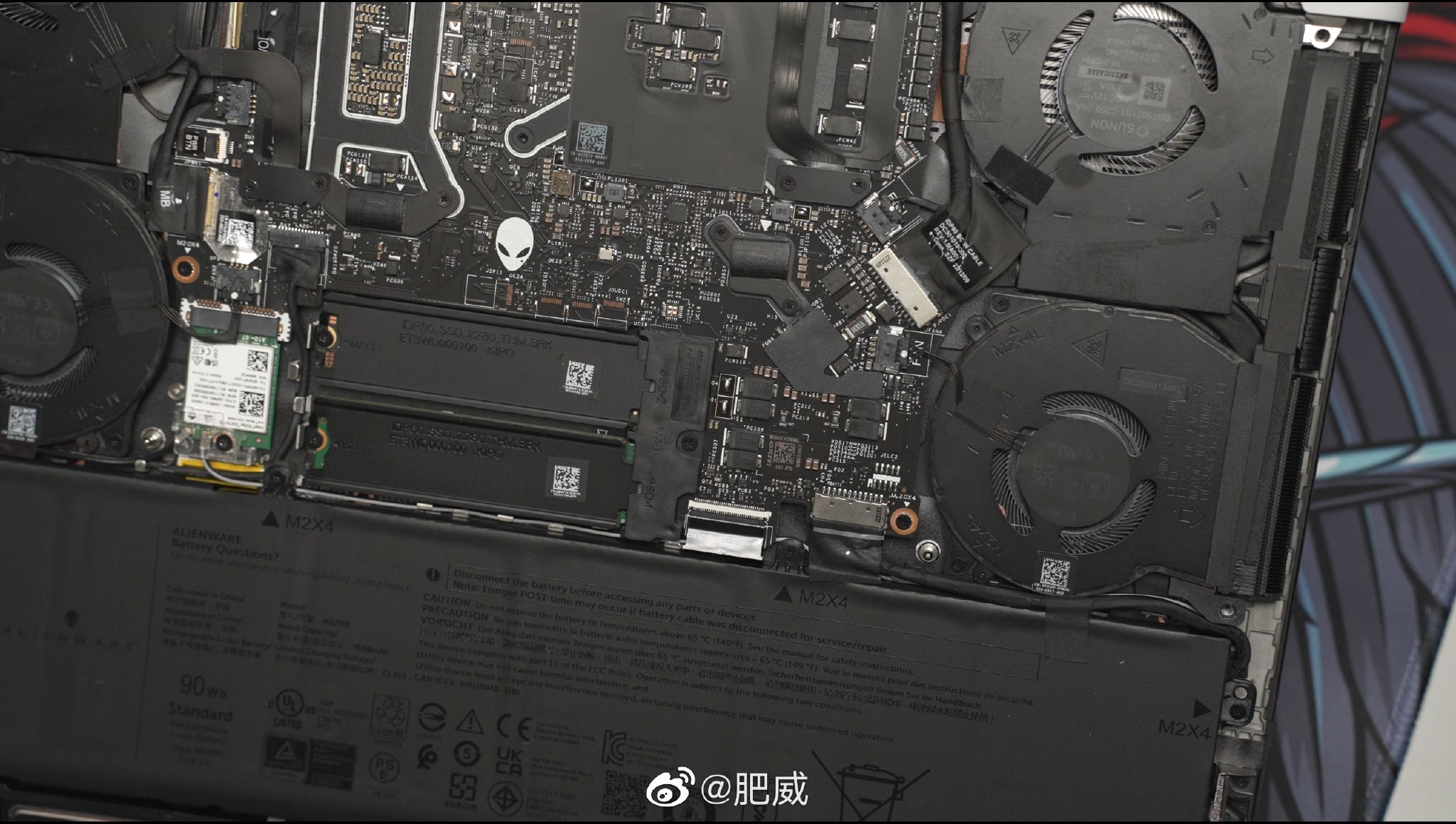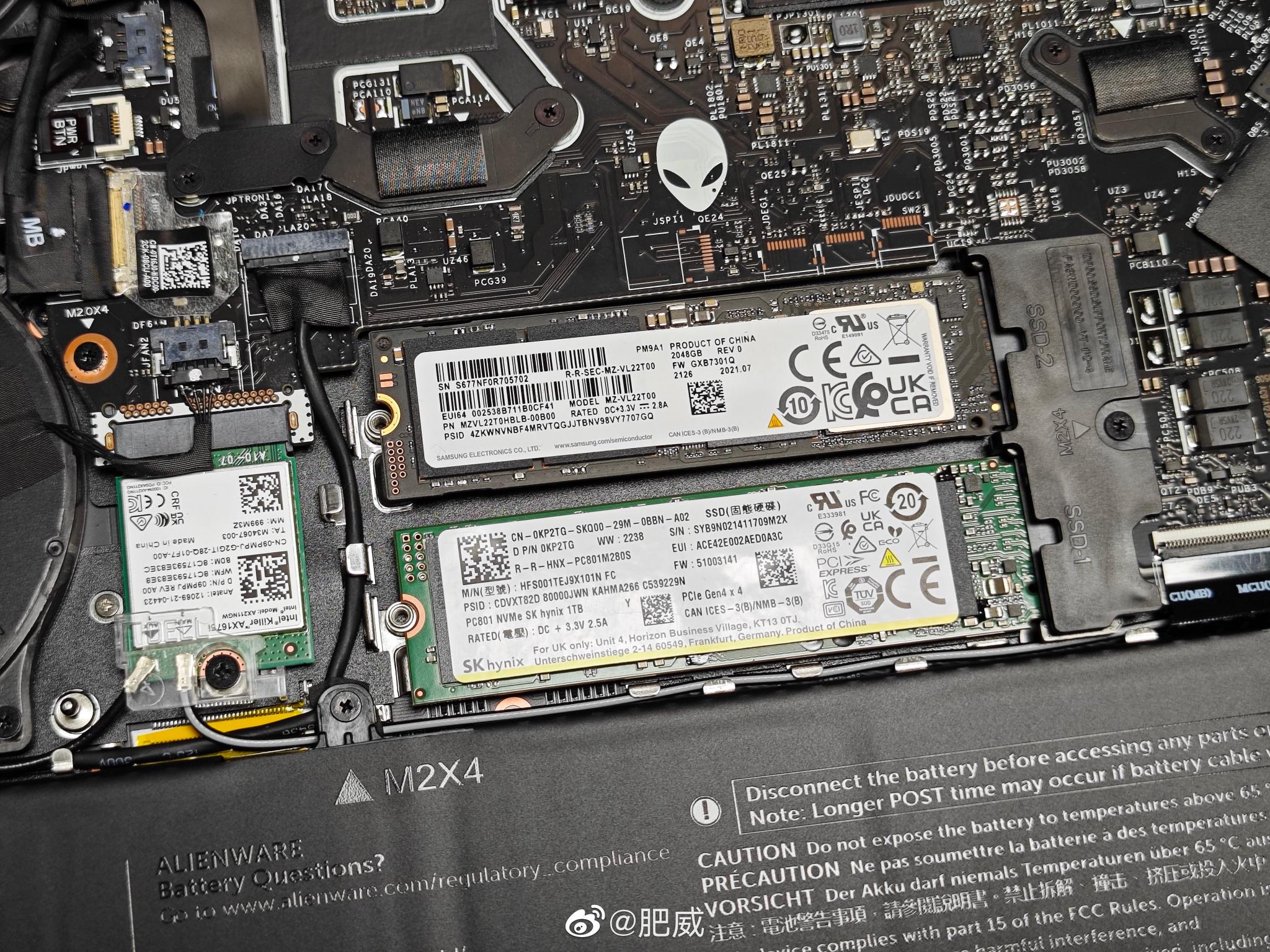 外星人X16开盖还算简单,卸掉6颗螺丝,翘片稍微滑一下直接就开了,内部很规整,看着挺舒适。预留多了一条M.2扩展槽,跟主盘一样也配了一块薄薄的散热片,这个好评,薄也总比裸奔好[欢乐熊出没]因为底下多了一块垫片,不想撕开只能考虑单面颗粒的盘了,PM9A1 2T安排上,加起来3T很够用了。这个预装的PC801 1T测了一下数据比我台式机的P44 Pro 2T菜不少,尤其是4K都跟E26那些菜鸡PCIe 5.0一个水平了。一个可能是系统盘有负加成,另外可能就是笔记本平台不给力吧。这装在笔记本贴一小块金属的盘,温度竟然比我台式机装了散热马甲但是吃显卡尾气的盘还要低好几度,闲置时不过60[裂开]