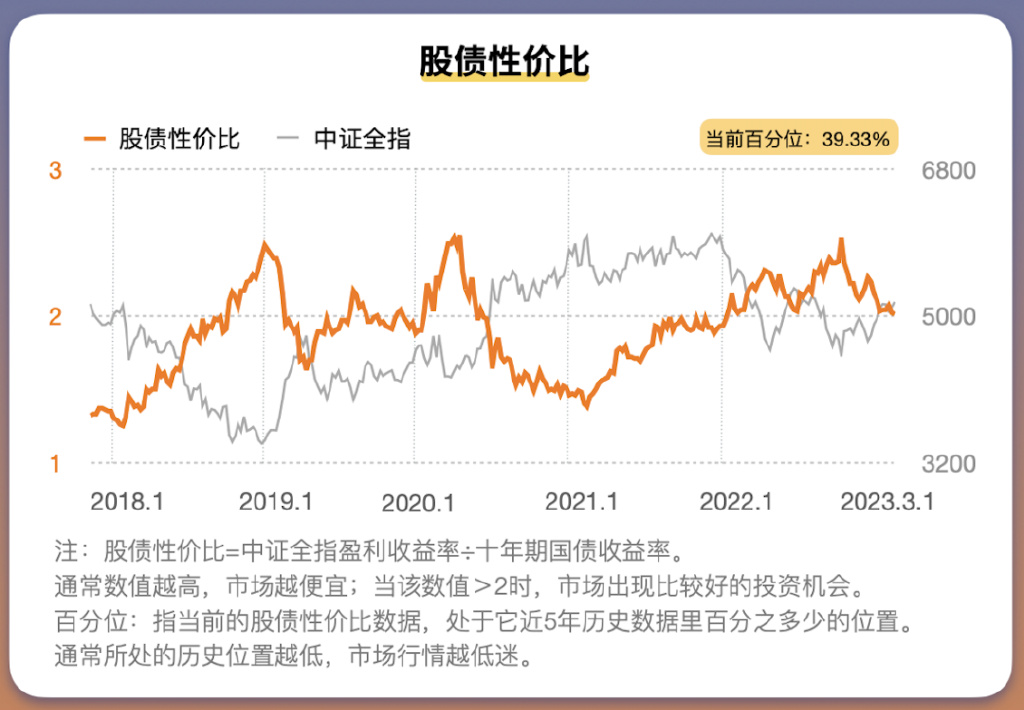 股债性价比,即用A股中证全指的盈利收益率,跟A股10年期国债收益率对比。