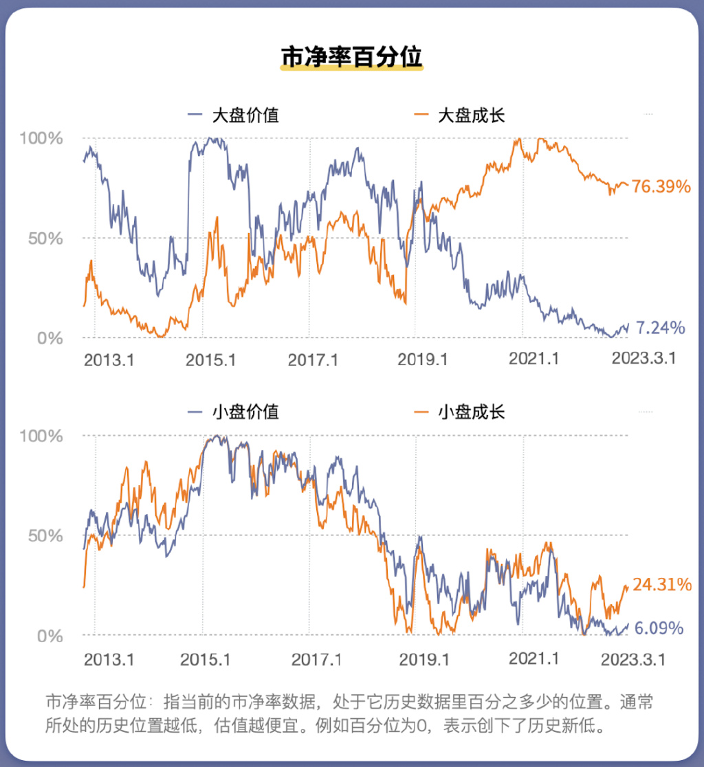 大盘价值、小盘价值在历史较低估值。小盘成长过去几个月从底部反弹了不少,还算在低估,但没有去年便宜了。